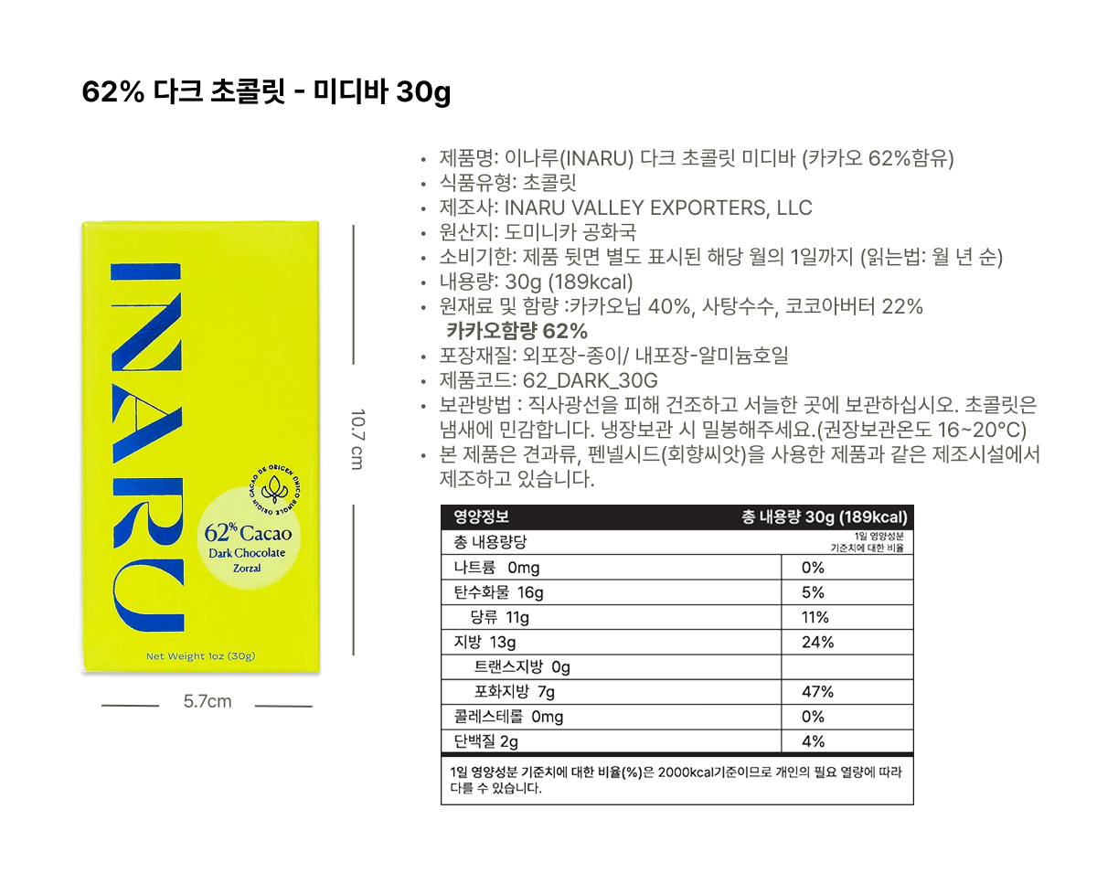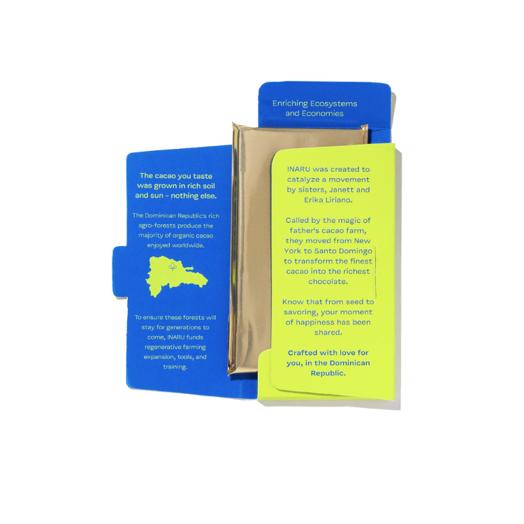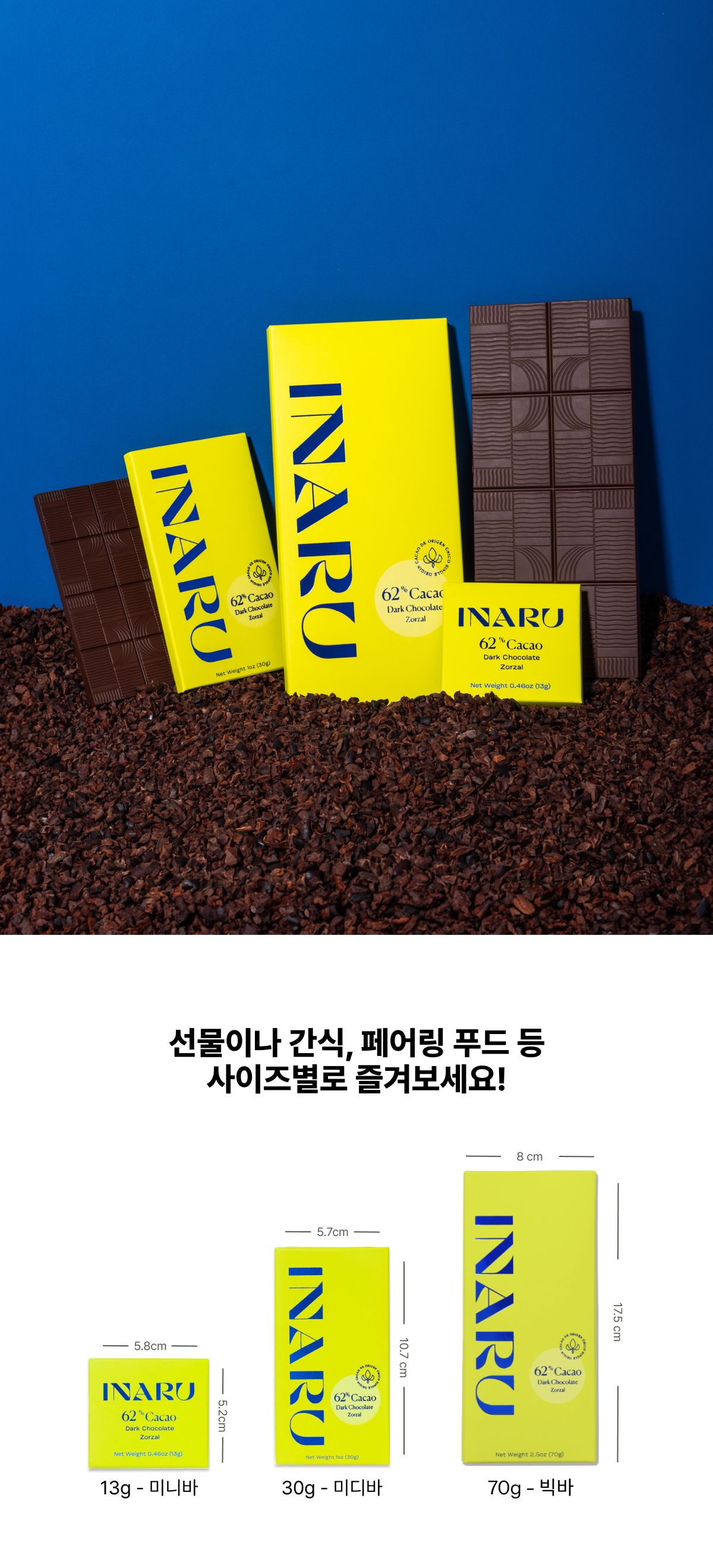 새 보호구역인 소르살(Zorzal) 지역의 원두를 사용한 이나루 62% 다크 초콜릿 바는 밀크 초콜릿을 좋아하거나 다크 초콜릿 입문자들에게 추천합니다. 부드럽고 크리미한 텍스쳐와 추가된 달콤함이 어우러져 부담 없이 다크 초콜릿의 장점을 경험할 수 있습니다.