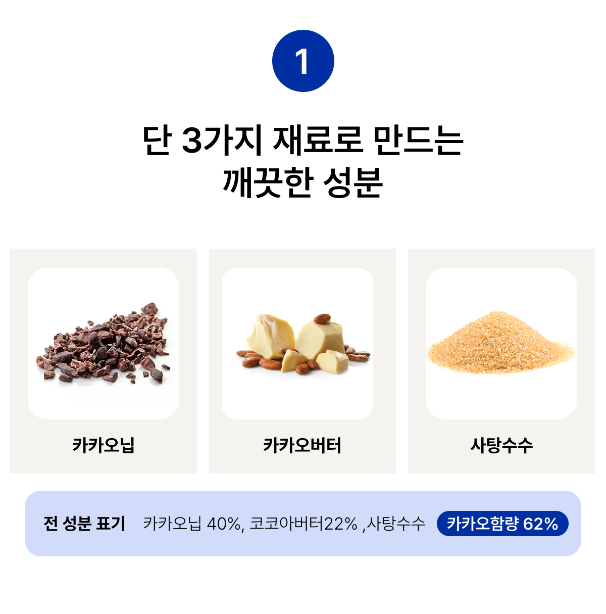 · 중간 맛: 순한 카카오의 쌉쌀한 맛과 은은한 카카오의 깊이, 부드러운 카카오 버터의 녹아내림.