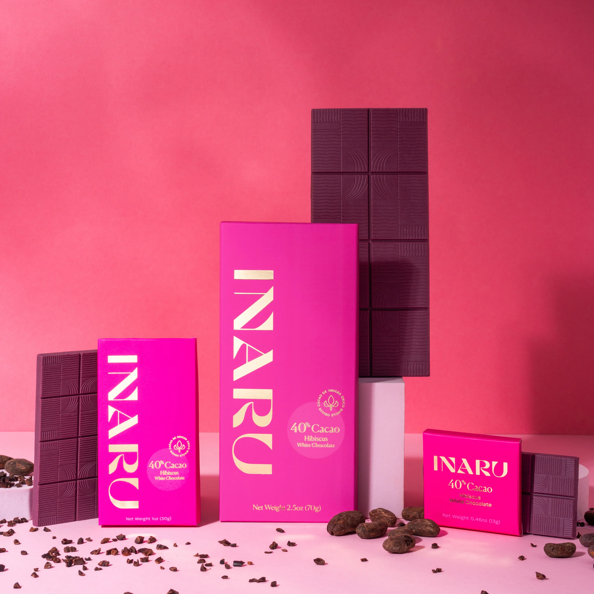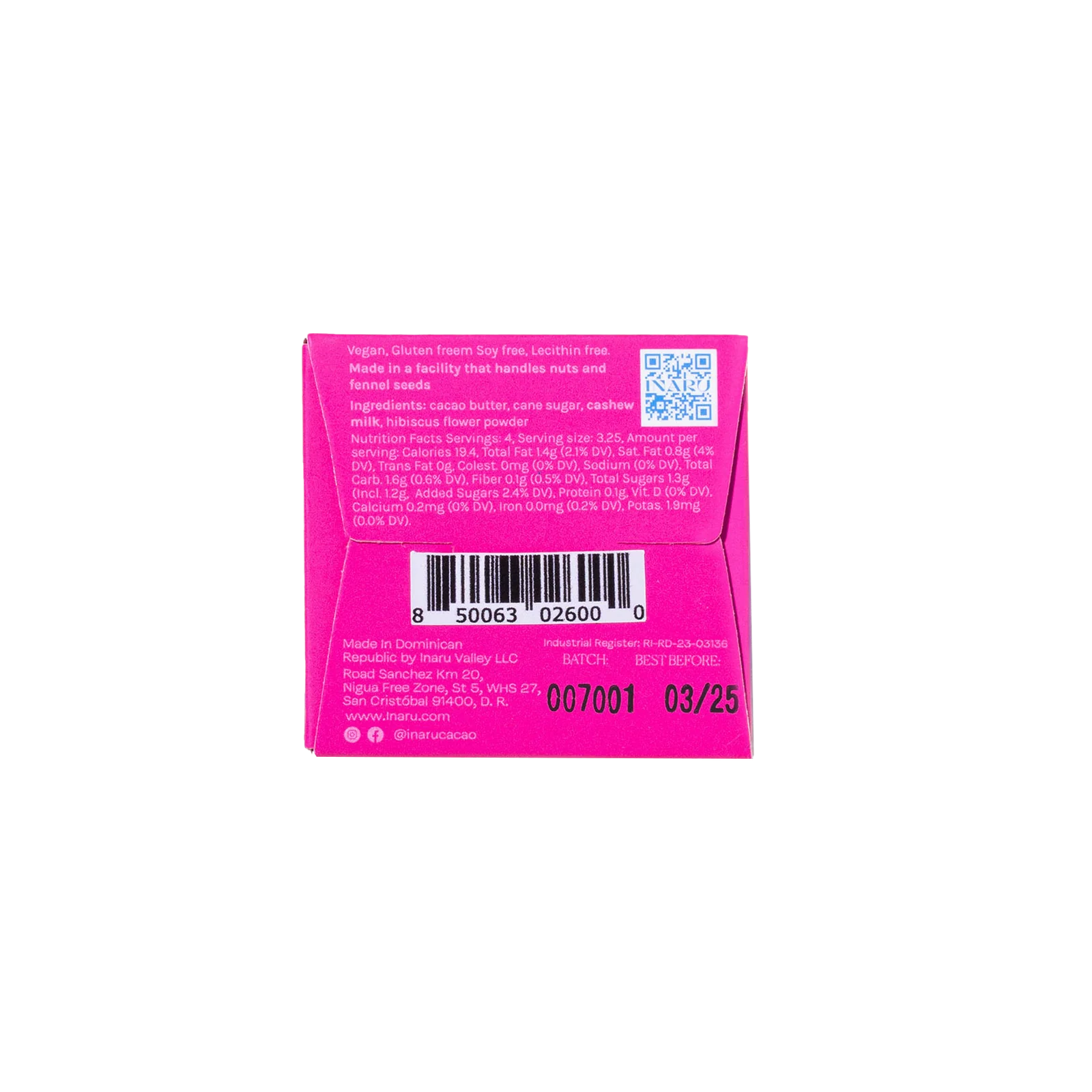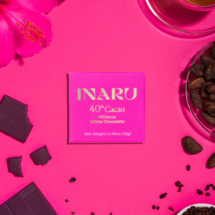 보랏빛 아름다움을 담아낸 이나루의 히비스커스 바는 화이트 초콜릿의 새로운 지평을 엽니다. 카카오버터, 히비스커스, 캐슈넛밀크가 빚어내는 세련된 하모니를 경험하실 수 있습니다.