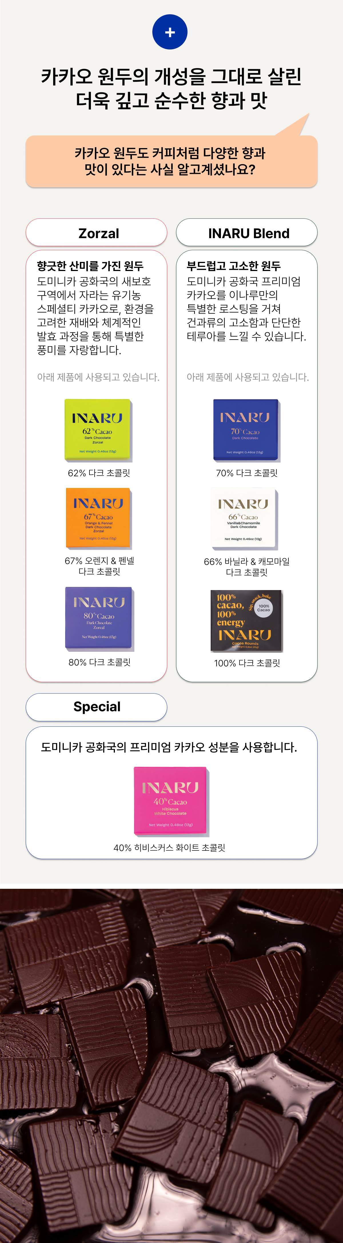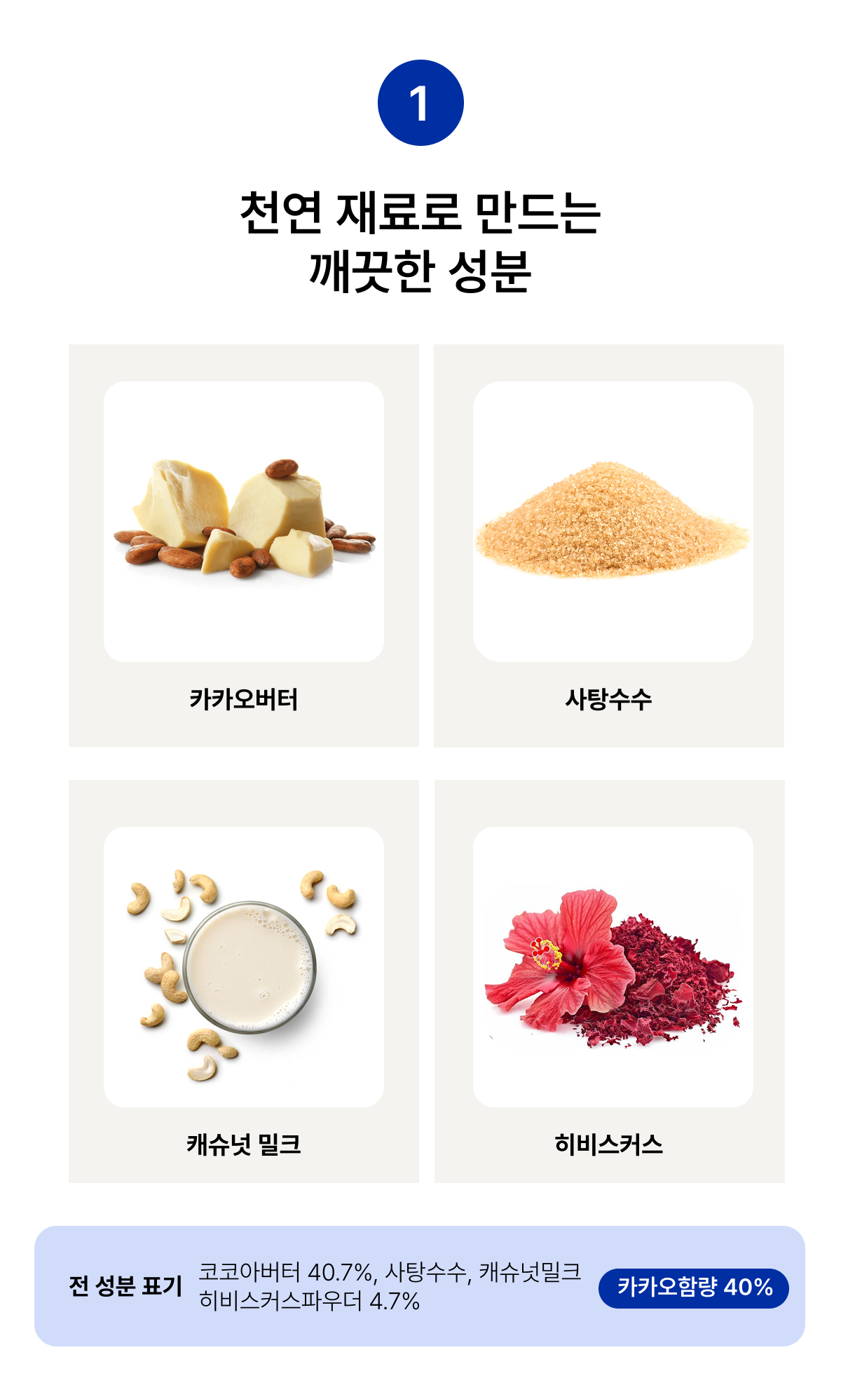 텍스처: 풍부한 카카오버터(40%+)가 선사하는 폭은한 녹음, 캐슈넛밀크의 실크같은 마무리가 입안에서 우아하게 펼쳐집니다.